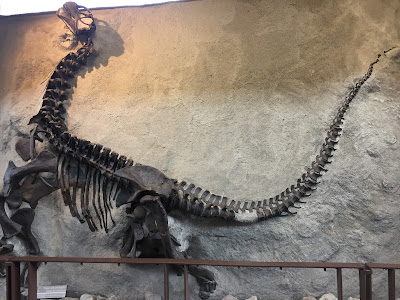 Of course, there is a dinosaur smack dab in the middle of the first floor. And the floor itself is an artistic mosaic designed to teach people about the local geology. And the building spirals up to represent that passage of time, the same way the walkway at the Natural History Museum of Utah in Salt Lake City does. (Maybe it's a thing these days for these kinds of places. Do other museums in other places do the same? You tell me.) There is a short film to begin, an interactive part for kids to play with, interesting things displayed well, lots of light, windows with views of the outdoor dinosaur garden. Overall a real nice little museum.